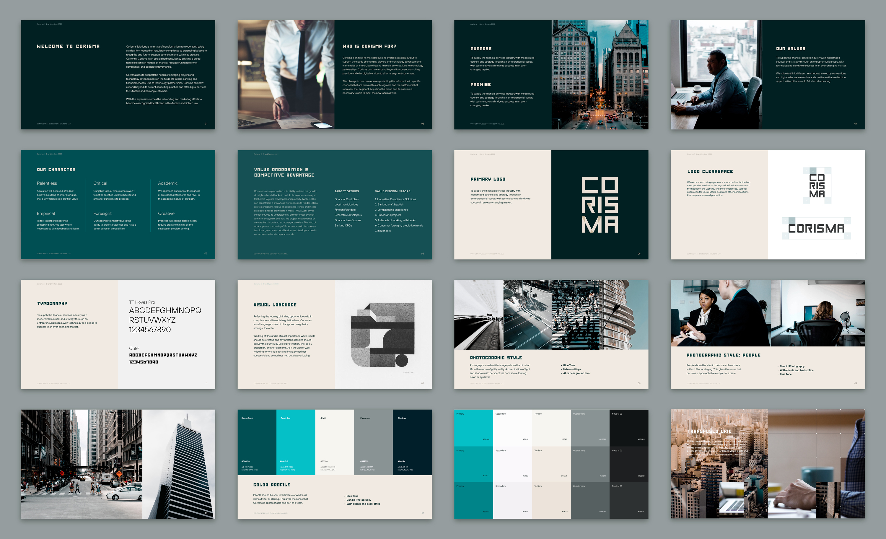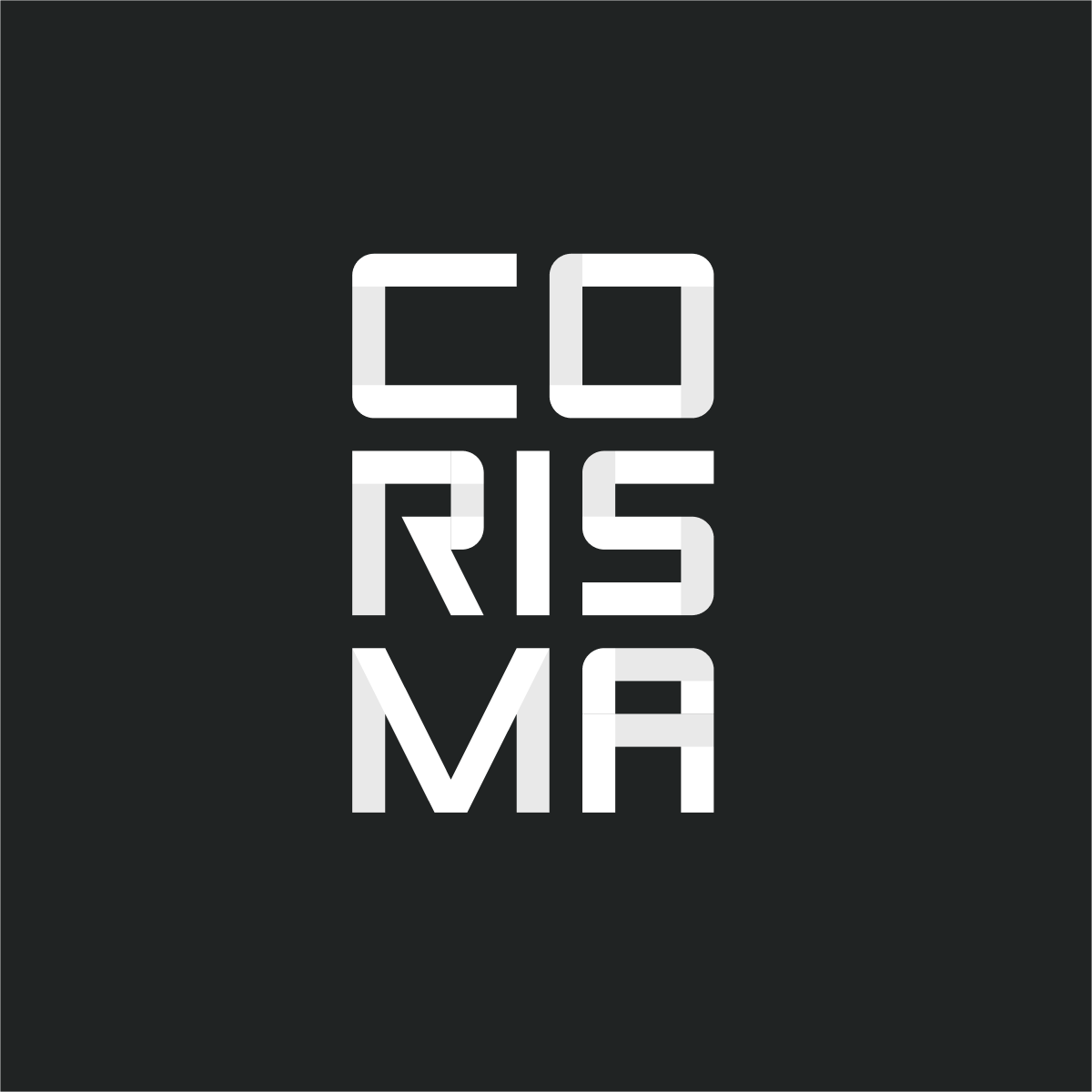 After establishing branding norms and rules, we discovered a play of the design grid as the thematic device for Corisma's identity. The idea of order and creating compositions based on adhering and breaking that order was intriguing. Horizontals and verticals in dynamic play with diagonals and triangles gave the sense of the experience of experimenting on new ground in a heavily regulated environment.